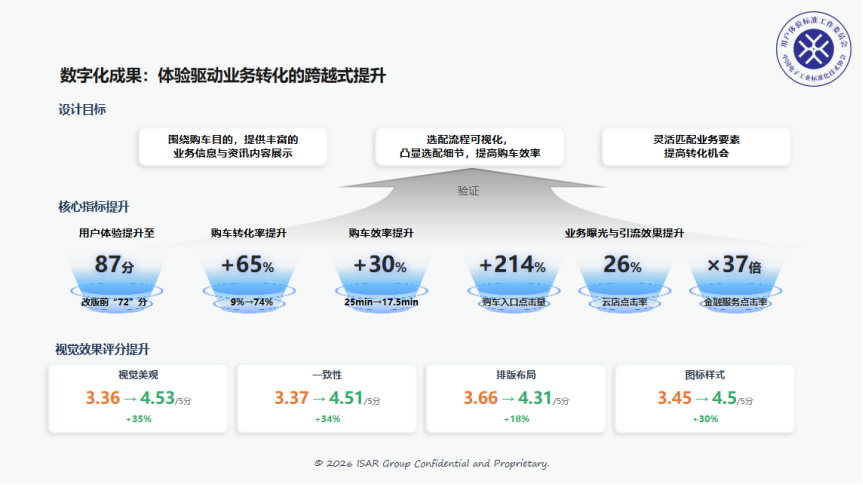 改版上线后,平台持续追踪各项体验指标与业务转化数据,验证了体验优化带来的显著成效——不仅用户主观评分大幅提升,购车流程耗时明显缩短,购车转化率也实现了跨越式增长,充分体现了用户体验数字平台“以体验驱动业务增长”的核心价值。