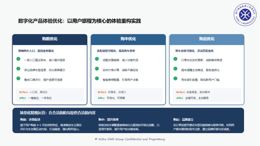 研究团队通过可用性测试、用户之声分析和埋点数据追踪,对在线购车流程进行全面诊断,识别出购车入口不明确、选配流程复杂、信息分散、流程耗时过长等多类体验问题,并据此建立了多维度的体验度量基线。基于研究数据,设计团队以用户旅程为中心对购车流程进行系统性重构,包括优化入口布局、实现选配流程可视化、聚合关键信息、精简操作步骤等。