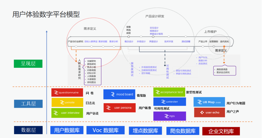 2. 工具层:通过数据分析工具,引入适用的AI技术,对数据进行归纳、分析和总结。挖掘用户需求、感知体验质量、构建量化指标。